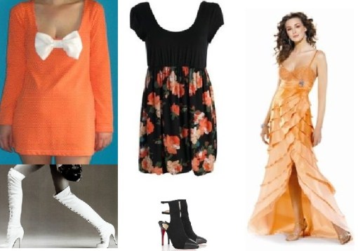 Caroline’s dress is, well, very orange and is of unknown design. I looked up some vintage Gucci from the sixties and there were some of similar style and so that’s what it is for our purposes. Christian Louboutin boots are standing in for Dennis Fields who is a figment made up for the story. Catherine’s dress is an ABS dress. Since ABS is famous for knock-offs, it made sense to have Carrie take pride in Catherine’s dress having been worn by a Celeb (fill in the Nicole of your choice) to the premier of a movie based on one of Charlie’s books. Again, Louboutin’s sub in for Dennis Fields. (I could never ever wear such shoes myself! Wide feet…) Liz’s dress is Vera Wang, but not a current gown. It was hard to find an orange-ish gown that didn’t look too bridesmaid-y or poofy 80’s prom-ish. Liz suffered enough humiliation without having to wear a clown-gown! Her shoes are unknown… but we can attribute them to the fictional Dennis Fields.
